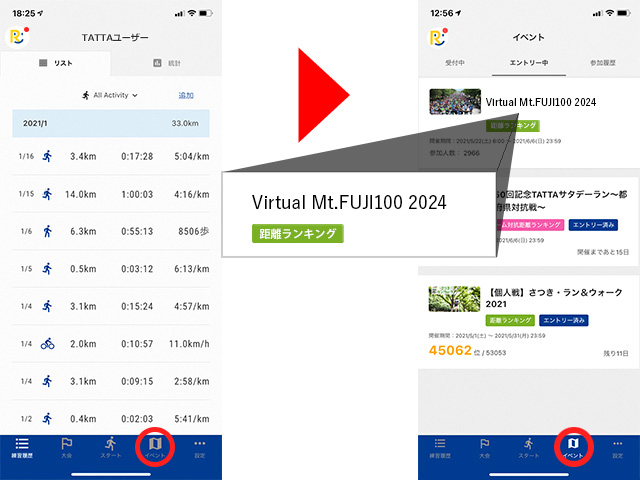 Tap [Event] in the TATTA app and check if [Virtual Mt.FUJI100 2024] is displayed. If it is, you are all set! (This will be reflected on the same day, once you enter the race.)