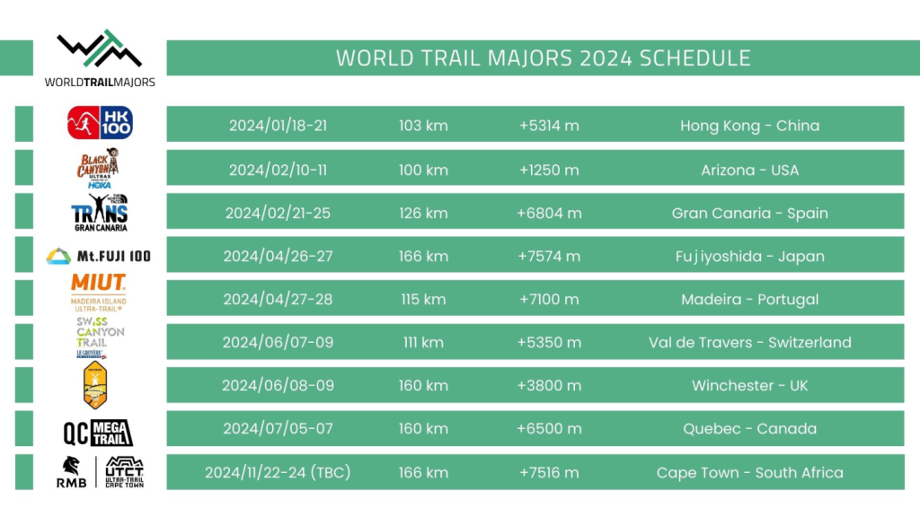 トレイルランニングとウルトラマラソンは、他のスポーツとは異なり、自然のアウトドア環境でシンプルなルールで楽しむことができるスポーツです。選手は複雑なルールに縛られず、自然の中で自由なランニング体験ができます。ワールドトレイルメジャーズの枠組みでは、このスポーツの真の価値を守りつつ、誰にでも開かれ、アクセスしやすい気風を保ちたいと考えています。地域の組織を巻き込み、地域コミュニティを大切にし、地域経済を活気づかせる。レースそのものは自然環境への影響を与えない形で運営されることが重要ですが、選手にとっては大会が生涯心に残る素晴らしい思い出となるべきです。ワールドトレイルメジャーズは、2024年に初めて開催されるオープンな大会で、以下の大会が予定されています。